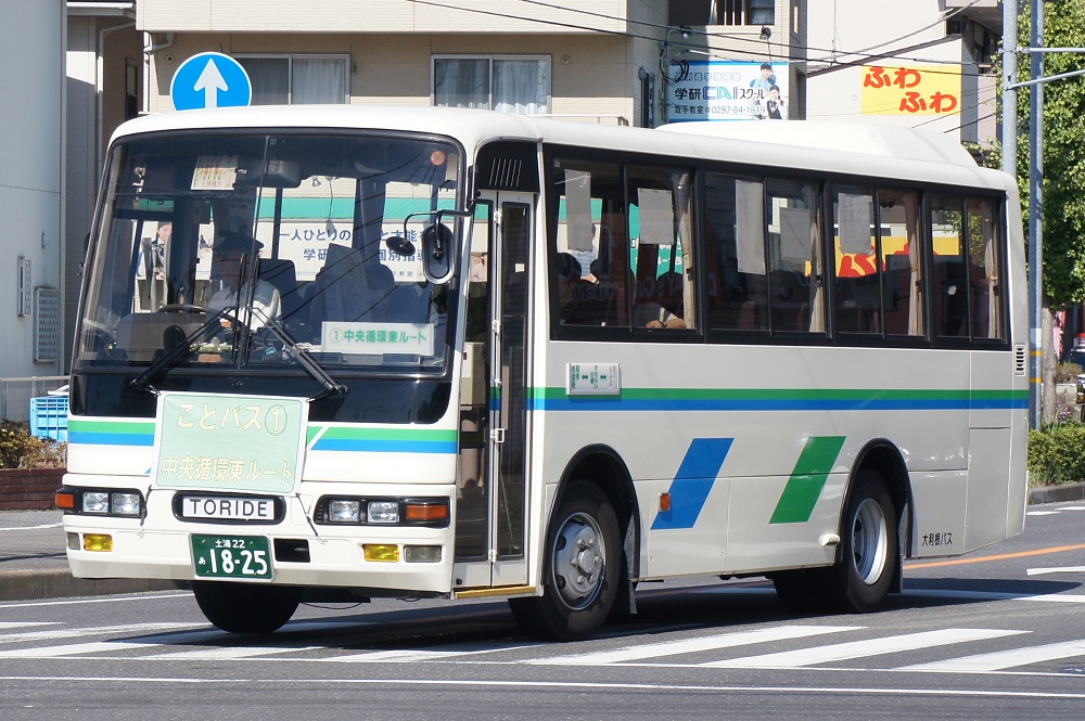 大利根交通が所有する、取手市コミュニティバス「ことバス」用車両です。中央循環東ルート・東南部ルートの車両が点検整備の際などに、代走として運用される姿が見られます。以前は同市の福祉バス「元気ですありがとう号」として使用されていました。