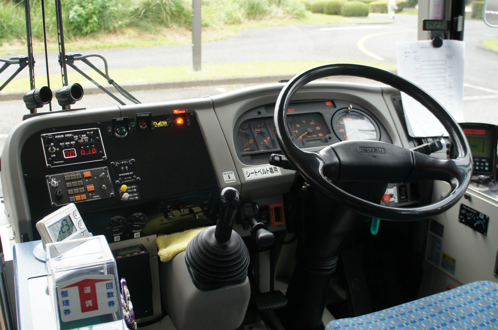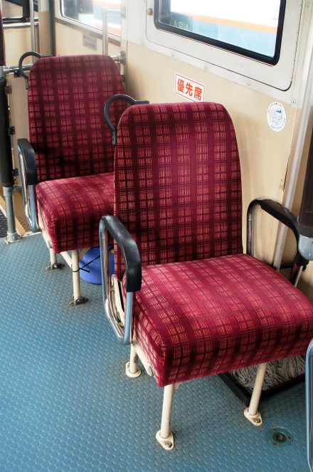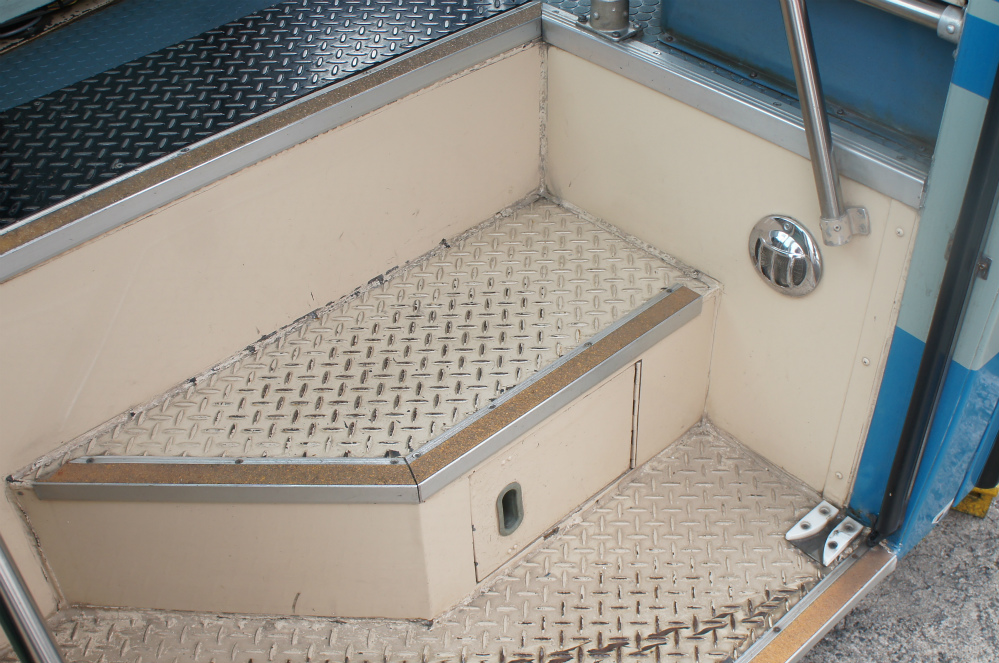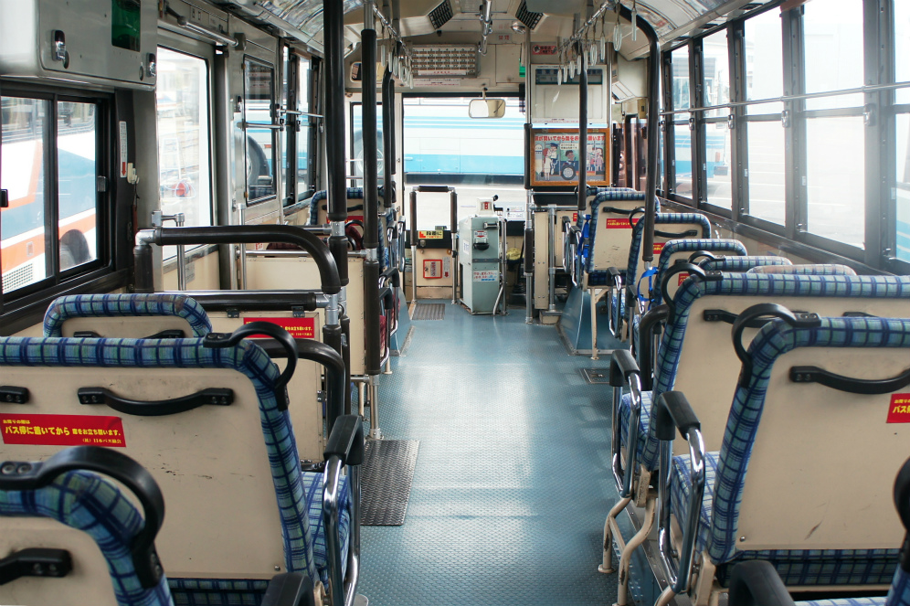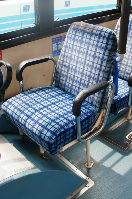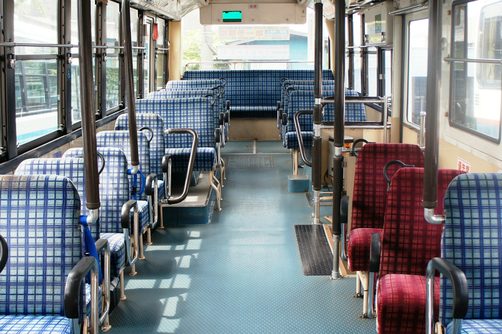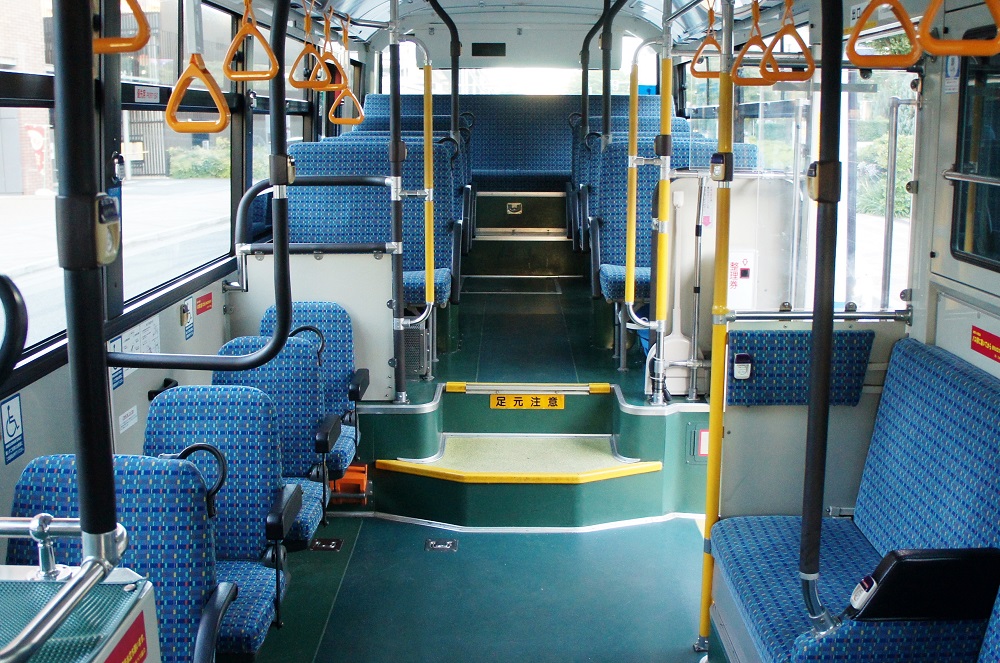 車内は、床材は通路部が緑色で降車口部のみ黄色、青い柄物の座席表皮に、手擦りは黒色の緩衝材を基本とし、乗降口近くは黄色の緩衝材が施され、黄色の吊り革が目を引きます。降車釦は手擦りと壁面にWS-240、窓の縦桟にWS-220、横桟にWS-250が設置されています。運賃箱は小田原RX-NZSです。