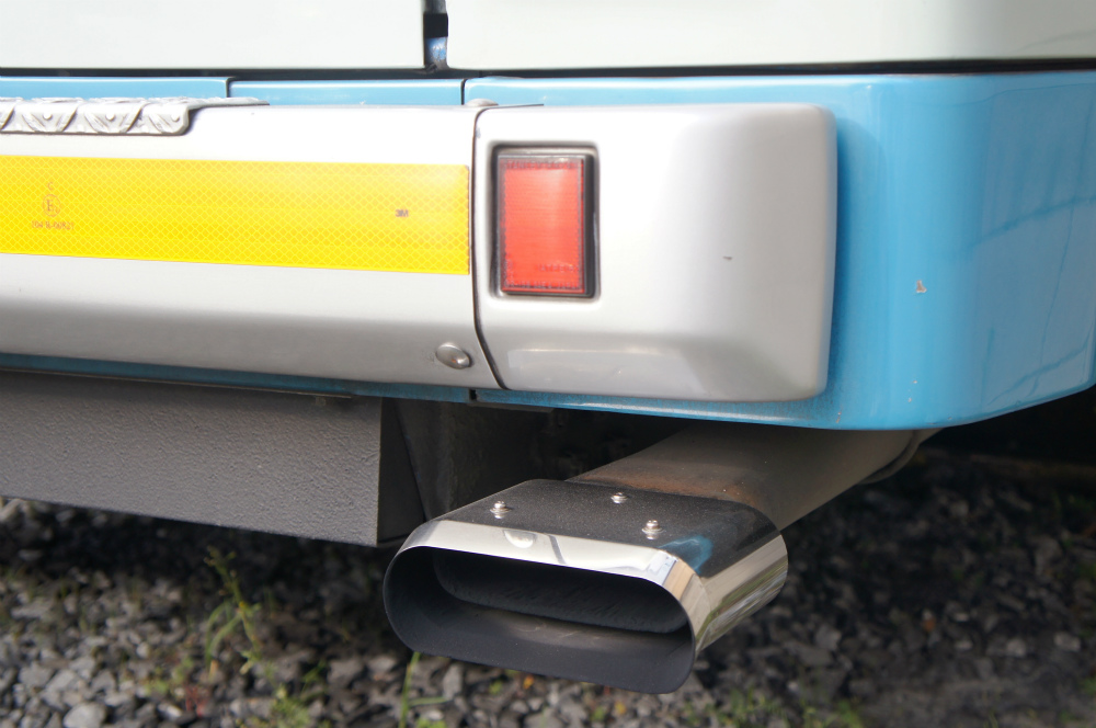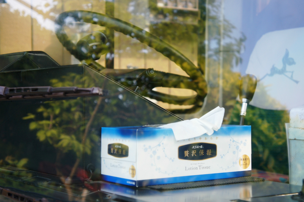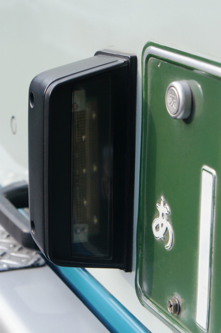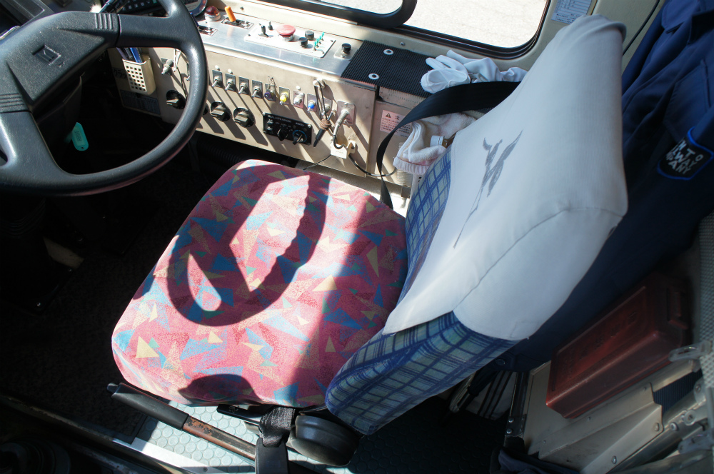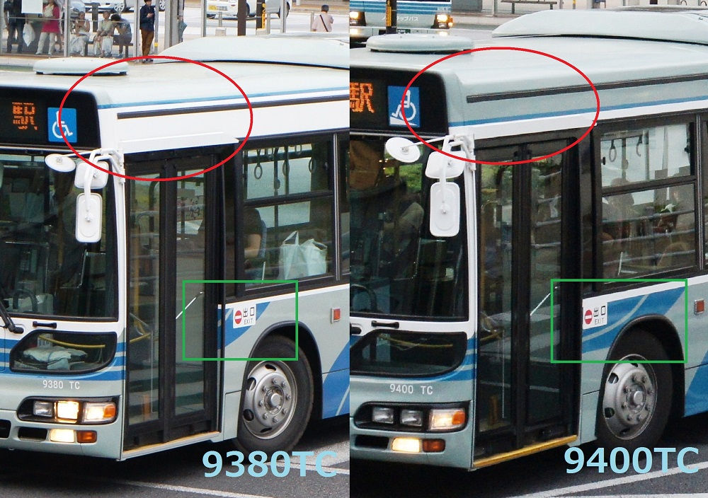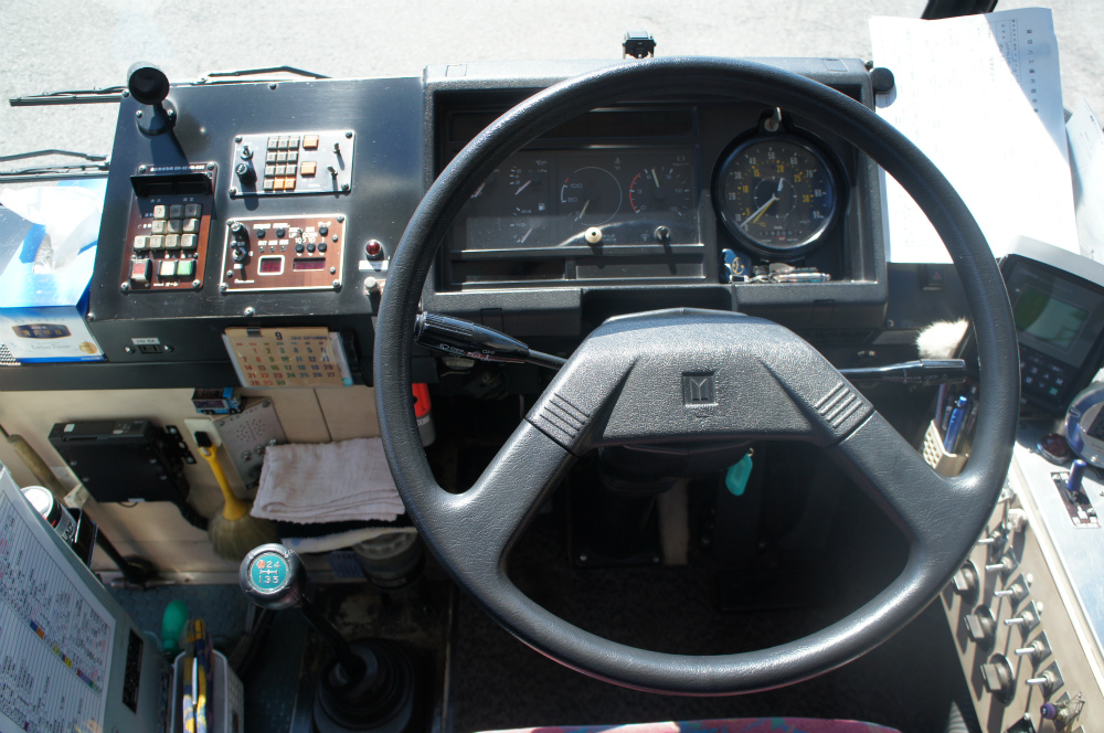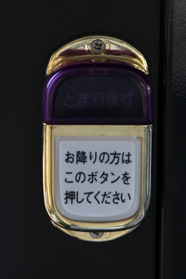 車内は、床材は通路部が緑色で降車口部のみ黄色、青い柄物の座席表皮に、手擦りは黒色の緩衝材を基本とし、乗降口近くは黄色の緩衝材が施され、黄色の吊り革が目を引きます。降車釦は手擦りと壁面にWS-240、窓の縦桟にWS-220、横桟にWS-250が設置されています。運賃箱は小田原RX-NZSです。